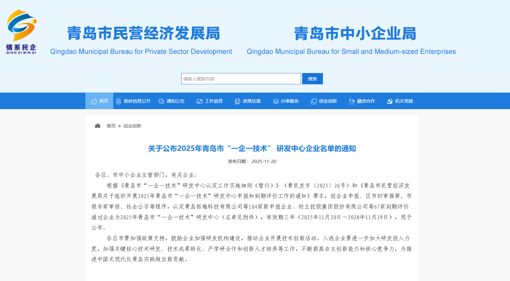 11月20日,2025年青島市“一企一技術”研發中心認定名單正式公布。青島海洋新材料科技有限公司(AMMT海美特)憑借在改性聚脲技術的深厚積累與創新成果成功獲得認定,標志著企業在高分子材料領域的專業實力和技術創新水平獲得官方認可,是海美特技術創新道路上的又一重要里程碑。