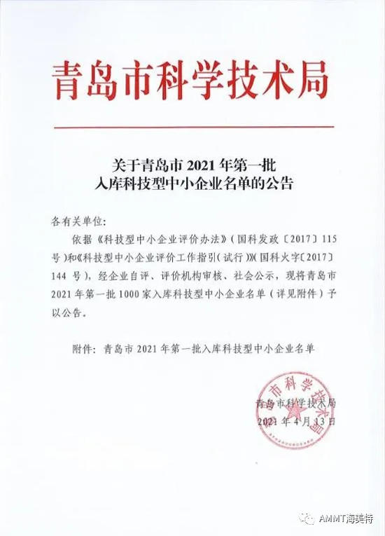 根據《科技型中小企業評價辦法》(國科發政[2017]115號)和《科技型中小企業評價工作指引(試行)》(國科火字[2017]144號)要求,青島海洋新材料科技有限公司經政府有關部門批準入庫成為“科技型中小企業”。這是我公司在提高企業自主創新能力、走創新持續發展道路上取得的又一喜人成果。