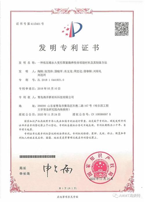 2020年11月24日,青島海洋新材料科技有限公司申請的《一種低壓縮永久變形聚氨酯彈性體填縫材料及其制備方法》發明專利獲得國家知識產權局授權。目前,公司共獲得國家授權專利32項,其中發明專利29項,實用新型專利2項,外觀設計專利1項。