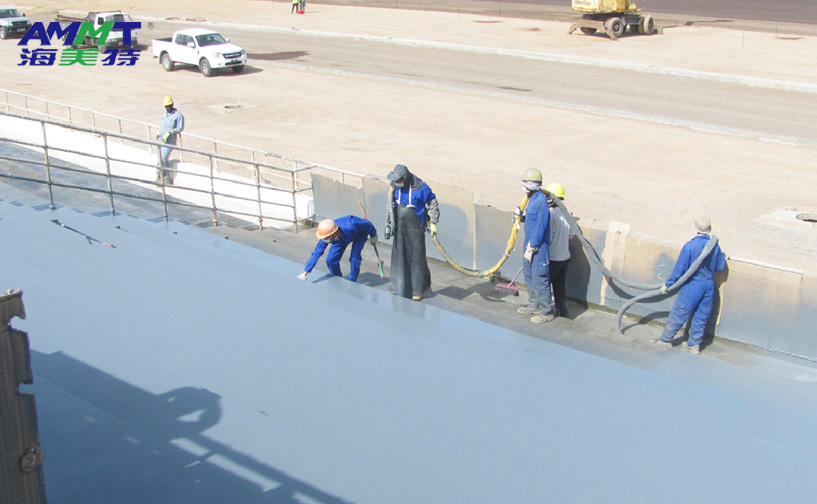 海美特自主研發的第三代噴涂聚脲彈性體材料,通過A組分改性半預聚體與B組分端氨基聚醚、胺擴鏈劑、納米填料、顏料組成,現場噴涂成型。